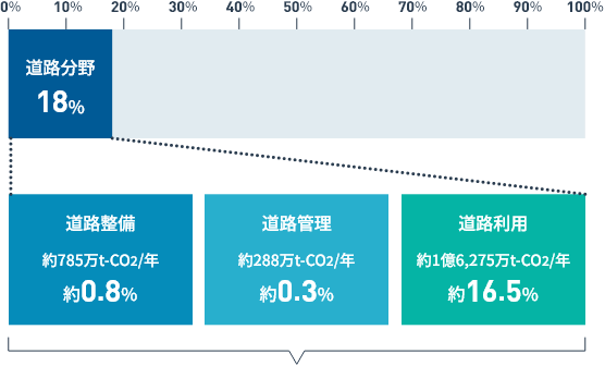 日本国内においては、道路管理、道路整備、道路利用といった道路分野に起因するCO2排出量が全CO2排出量の約18%と大きな割合を占めています。特に自動車利用による排出が大部分を占めています。